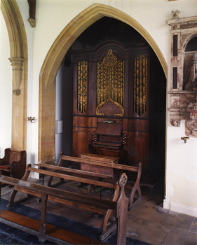 A notice in the church records, "The Hillington Church Organ. This organ was built by Snetzler in 1756. It has a dulcimer stop invented by him. The organ was built for a ... Duke of Bedford for his musical gallery. Afterwards it was at Christ Church, Westminster and then at the National Society's Training College, after which it was bought by Holdech (sic) the organ builder from whom it was purchased for Hillington Church where it was erected in 1857 almost in its original state...the keys are black and the sharps white. £20 worth of bass [pedals?] was added when it was placed in Hillington Church by Mr. Holdech (sic)."